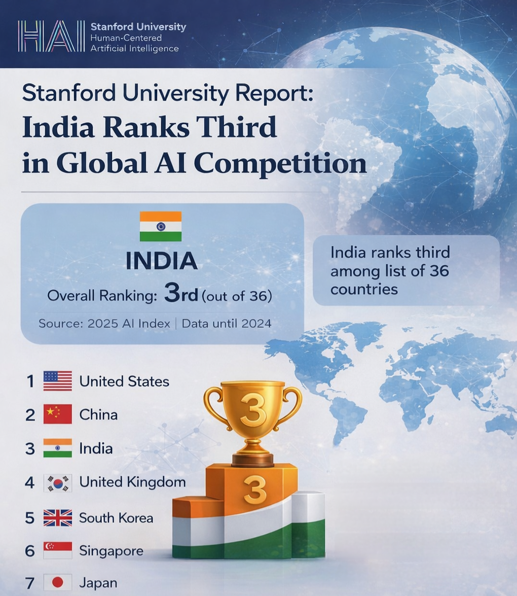 भारत की AI उड़ान: स्टैनफोर्ड HAI रिपोर्ट में 7वें से सीधे तीसरे स्थान पर पहुँचा देश